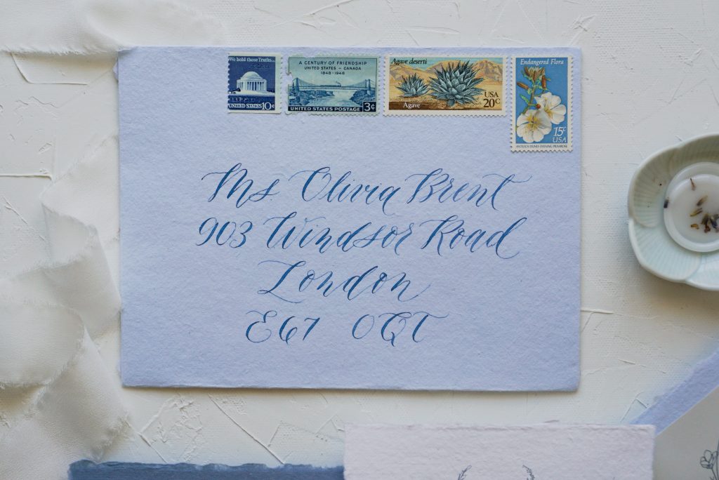 After you calculate your postage and source your stamps, you’ll have to figure out the actual layout of the stamps for the envelope. It’s best to discuss this with your stationer or calligrapher so they’ll know how much space to leave for addressing. It would be a shame to receive hand calligraphed envelopes from your calligrapher and realize later that there was not enough room for your vintage stamps!