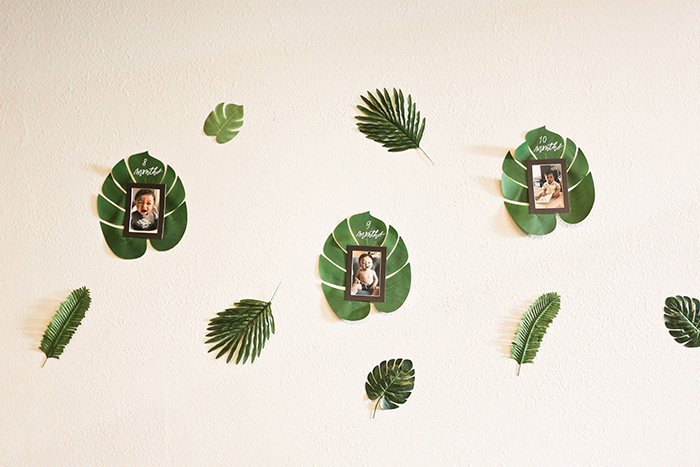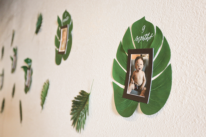 My sister helped with this adorable display. I calligraphed the monstera leaves with his monthly photos. 🙂