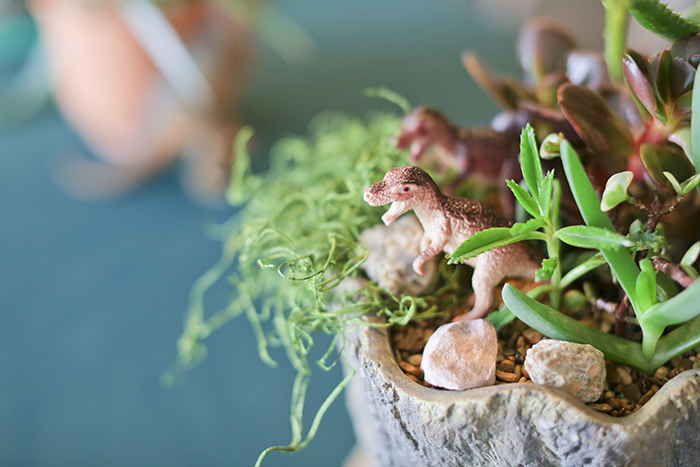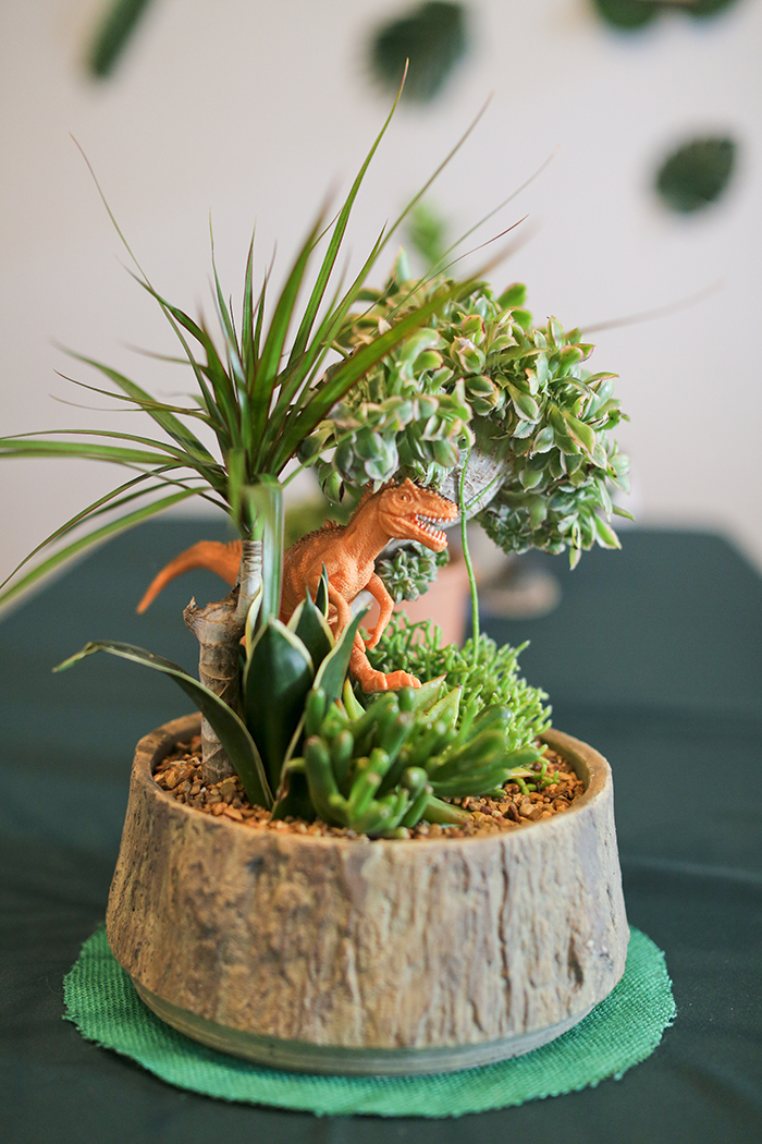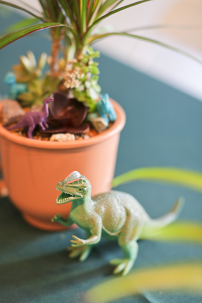 I owe this all to my mom, who lovingly sourced and potted each and every centerpiece. These were not tiny little pots either, each one was unique and beautiful and was the perfect little habitat for the dinos!