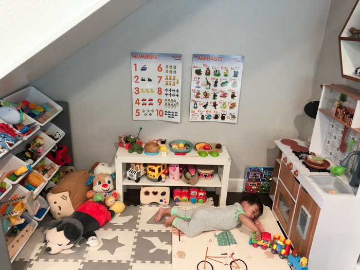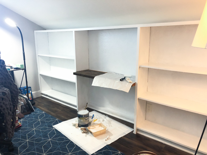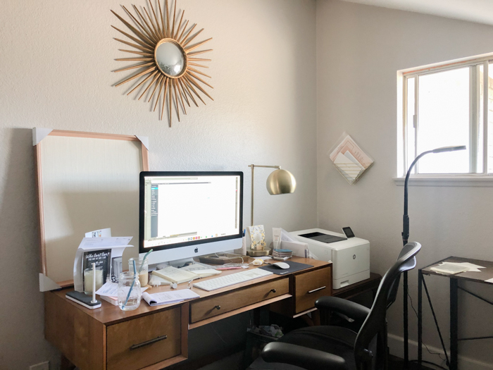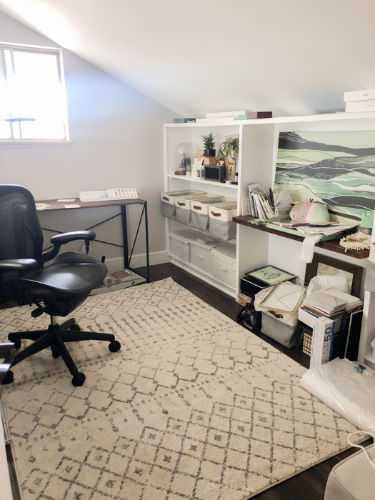 One huge productive thing I did was finally set up my permanent home office in our awkward room upstairs! We were using this room as storage for the past 3 years and it was about time to face the mess and clear out the junk. I used to have a little office nook underneath the stairs but we recently turned that area into a play den (see earlier photo), which makes way more sense for our tiny human. Anyway, this upstairs room is the perfect size and all I had to do was paint the built-in shelves and reorganize. I’m so happy with how it’s coming along.